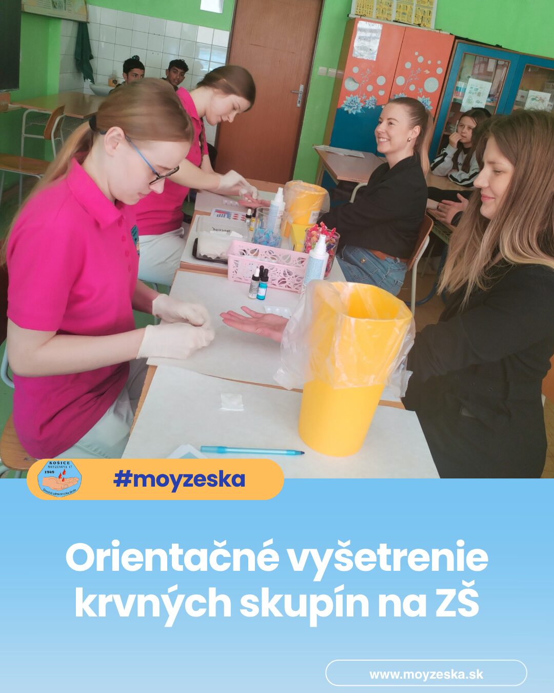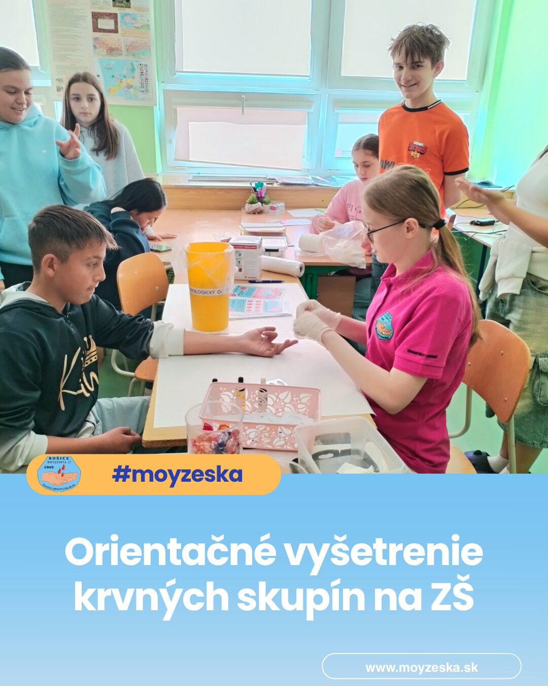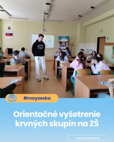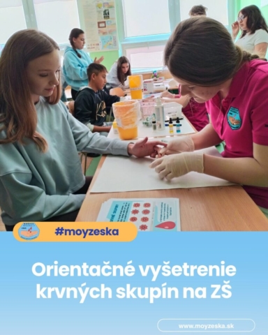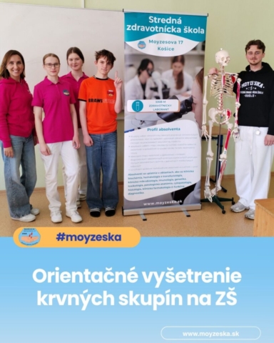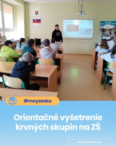 Zaujímavou časťou programu bolo aj orientačné vyšetrenie krvných skupín, ktoré realizovali Jakubove spolužiačky, Beáta Oravcová a Barbora Kleščová. Táto praktická ukážka umožnila žiakom vidieť prácu zdravotníckeho laboranta na vlastné oči a aktívne sa tak zapojiť do procesu poznávania.